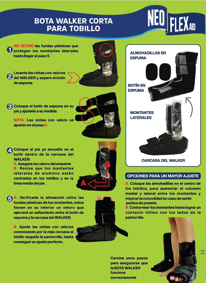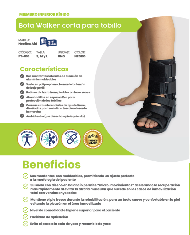 La Bota walker corta para tobillo ofrece un diseño innovador con dos montajes laterales de aleación de aluminio fijos, los cuales estabilizan e inmovilizan el tobillo, el pie, la pantorrilla e incluso hasta la rodilla en el Tipo Cam. Con un diseño acolchado transpirable y forro suave, su suela en forma de balancín de bajo perfil proporciona comodidad y estabilidad. Además, es fácil de colocar y ajustar gracias a las correas circunferenciales. Es ambidiestro, adaptable tanto para el pie derecho como para el izquierdo.