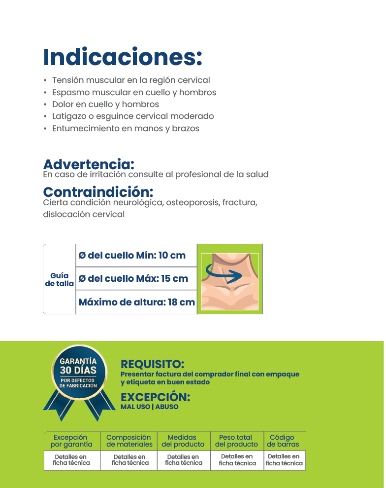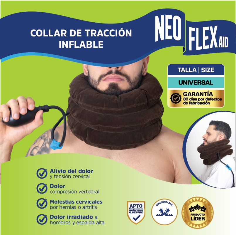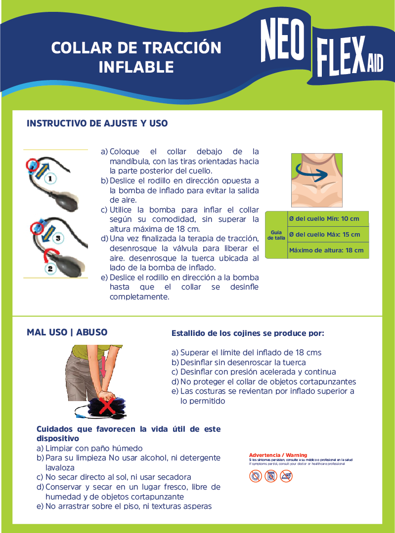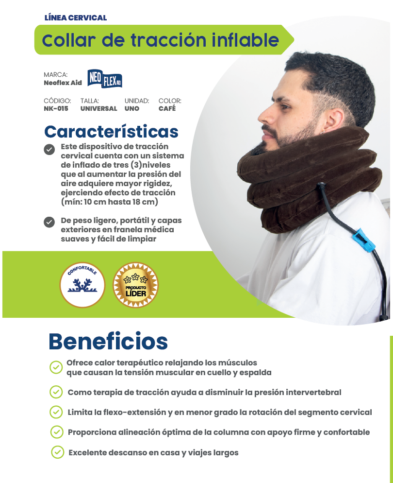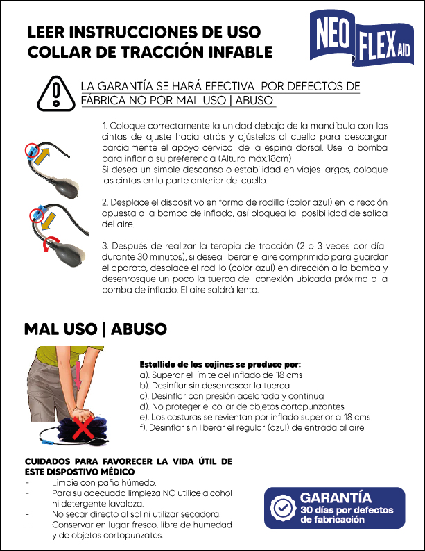 · Este dispositivo de tracción cervical cuenta con un sistema de inflado de tres (3) niveles que al aumentar la presión del aire adquiere mayor rigidez, ejerciendo efecto de tracción (mín: 10 cm hasta 18 cm)
