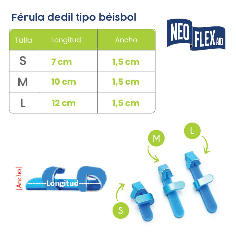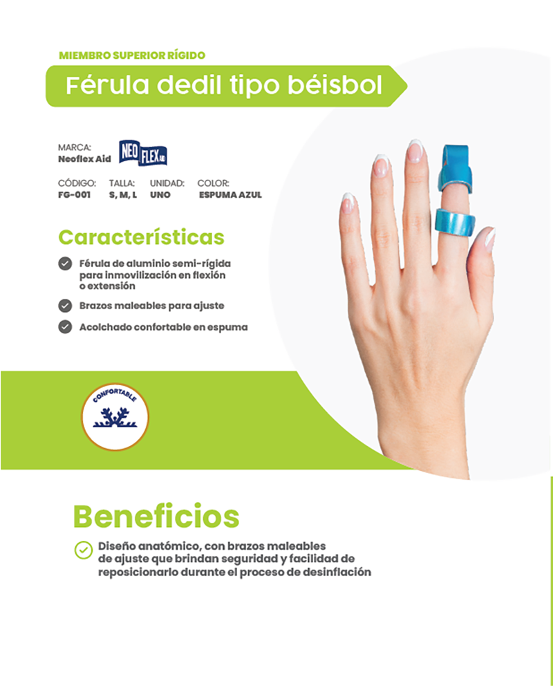 Nuestro Dedil tipo baseball tiene un diseño anatómico, con la gran ventaja de tener correas y sistema de ajuste que brindan ahorro en la compra de cintas adhesivas para su fijación.