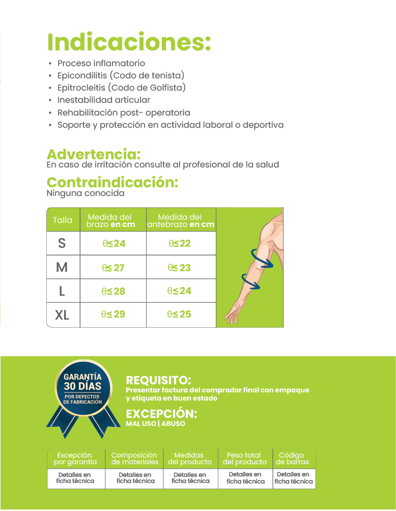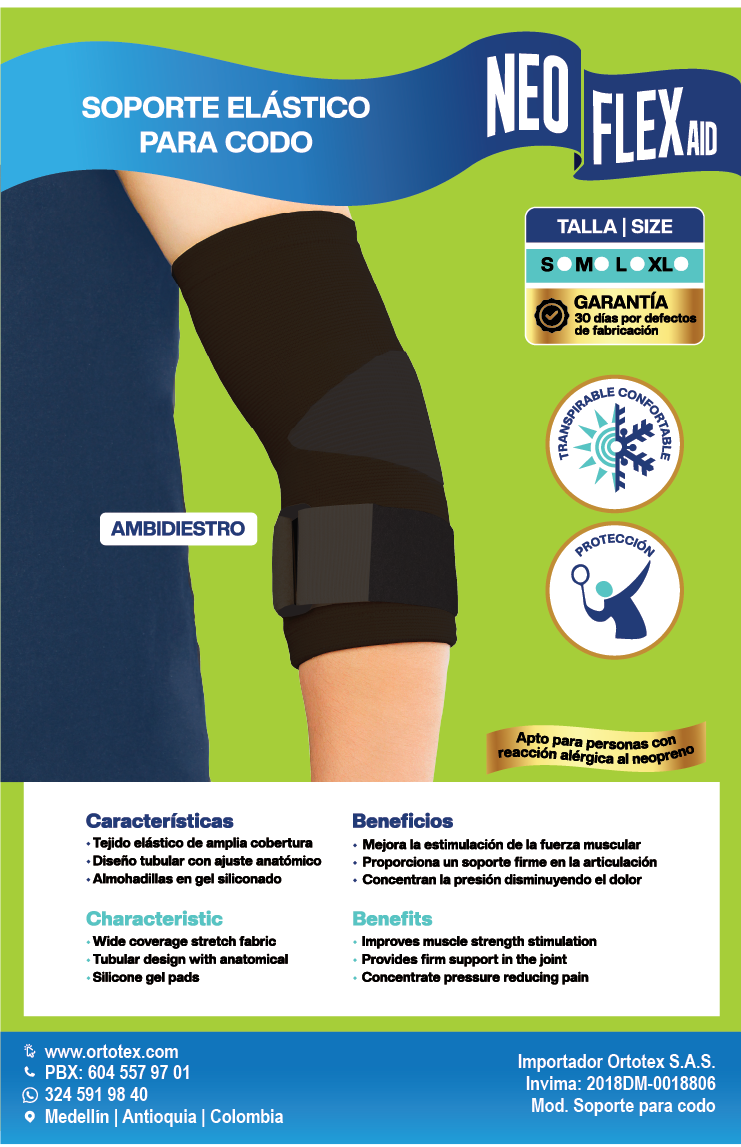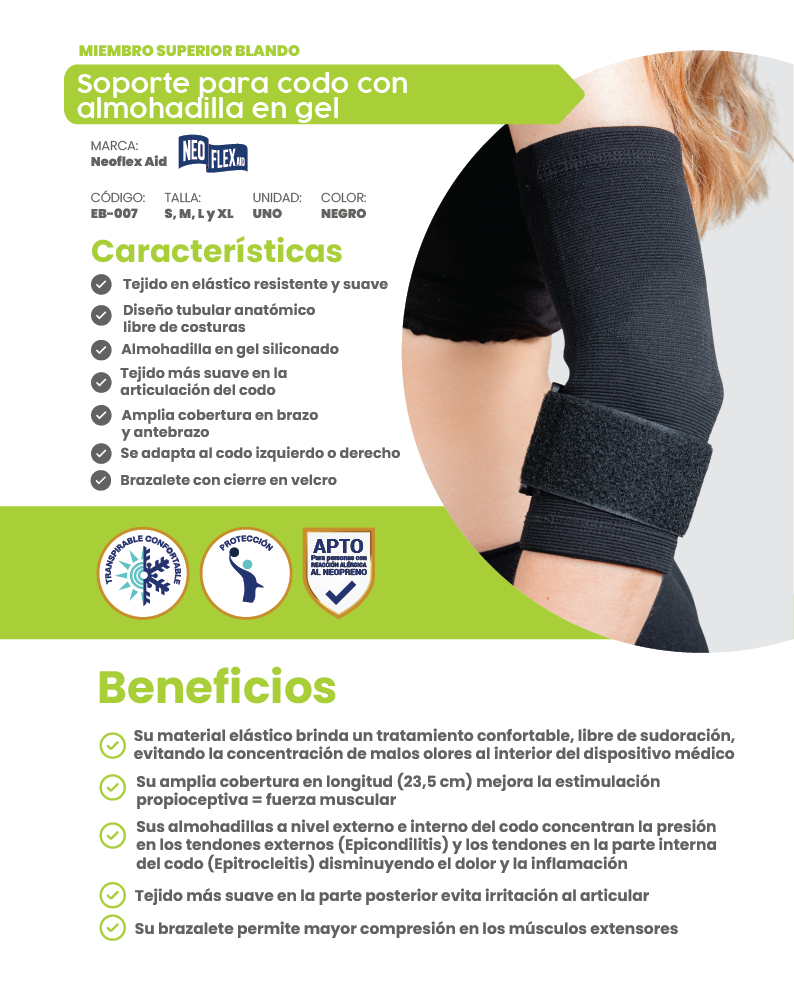 • Sus almohadillas a nivel externo e interno del codo concentran la presión en los tendones externos (Epicondilitis) y los tendones en la parte interna del codo (Epitrocleitis) disminuyendo el dolor y la inflamación.