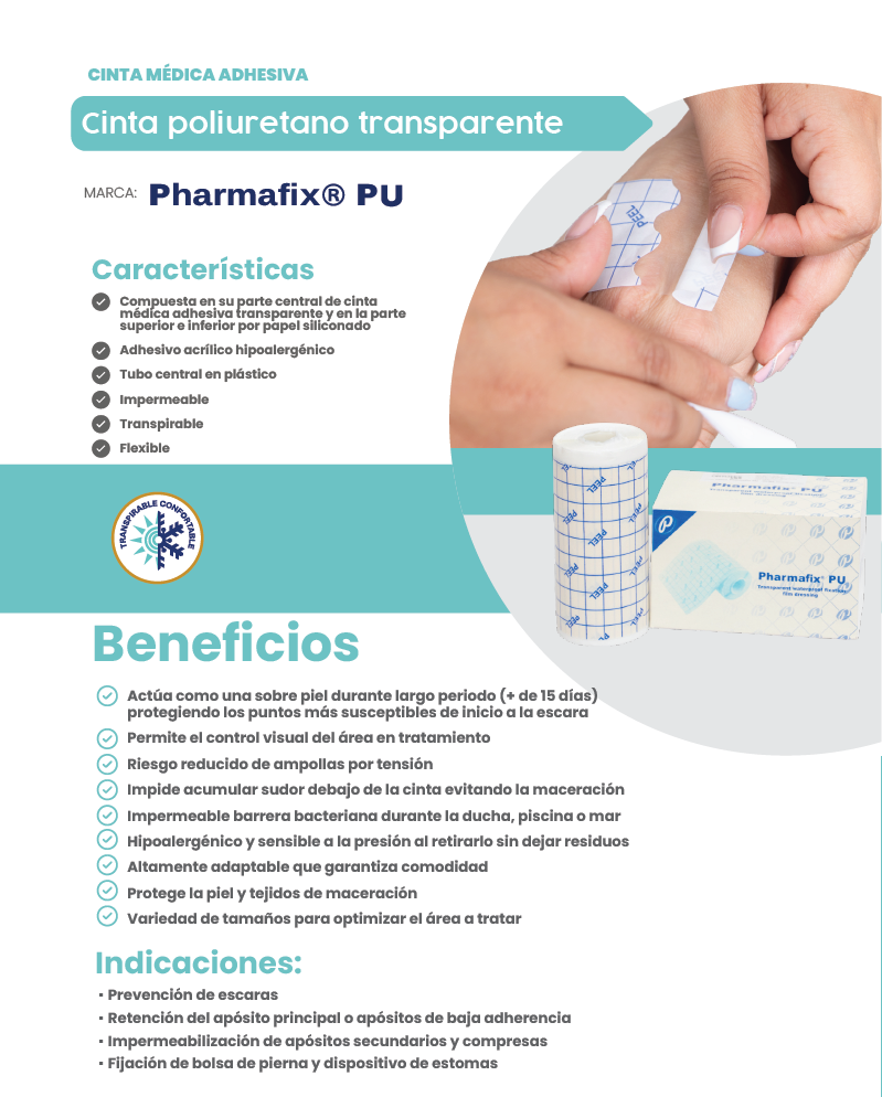 Pharmafix PU es una cinta médica innovadora diseñada para proporcionar un cuidado efectivo y cómodo para la piel. Su área adhesiva está recubierta en papel siliconado, lo que facilita su aplicación y remoción sin dejar residuos molestos. Fabricada con poliuretano transparente, ofrece una adherencia confiable y discreta, ideal para una variedad de aplicaciones médicas y de vendaje. Su adhesivo acrílico hipoalergénico asegura una fijación segura sin causar irritaciones ni reacciones alérgicas. Con un tubo central en plástico que garantiza una aplicación precisa y sin arrugas, Pharmafix PU es impermeable y flexible, lo que lo convierte en una opción ideal para entornos donde la durabilidad y la comodidad son primordiales.