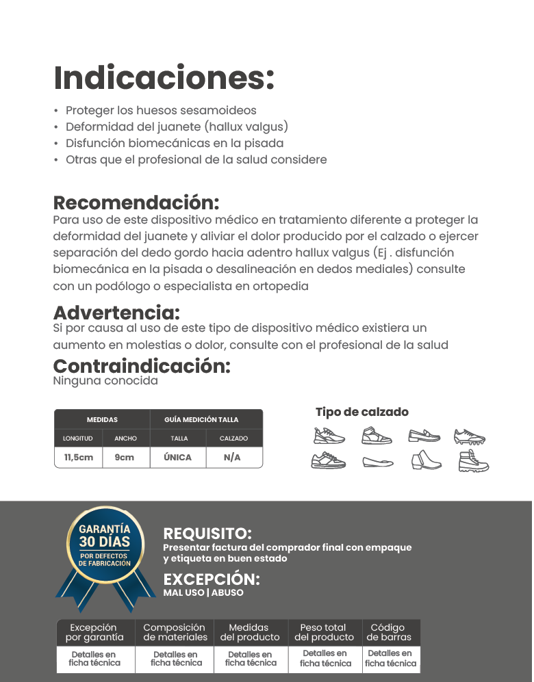 • Disfunciones Biomecánicas en la Pisada: Contribuye a la corrección de problemas biomecánicos al mantener una posición adecuada del dedo gordo.