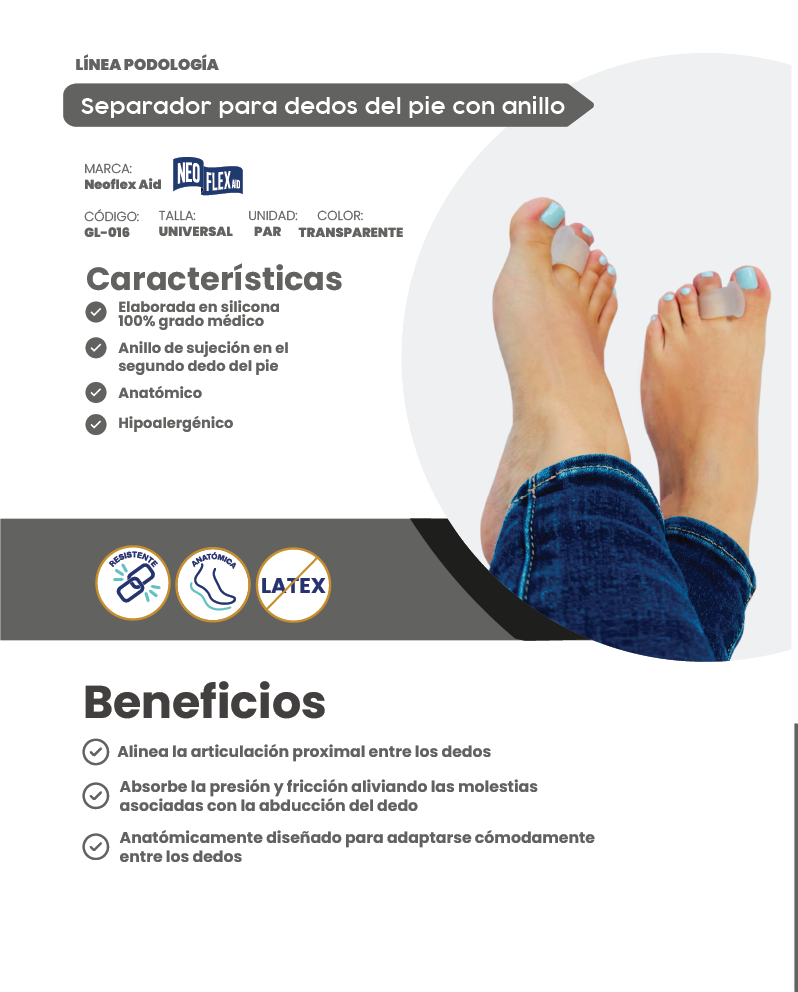 Nuestro Separador para dedos del pie en silicona es la solución perfecta para aliviar molestias y mejorar la salud de tus pies de forma cómoda y eficaz. Fabricado con silicona 100% grado médico, este separador ofrece una calidad superior y una sensación de suavidad excepcional para tus pies.